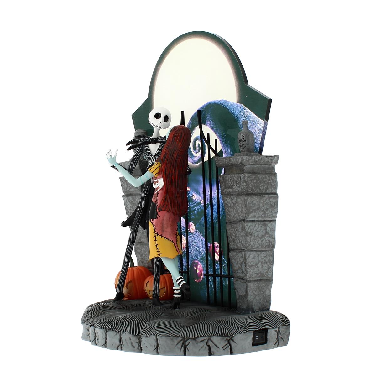 Una luna di Halloween illuminata fa da sfondo a questa tenera scena di Nightmare Before Christmas. Il valzer del cimitero di Jack e Sally è congelato nel tempo, con solo le lanterne di zucca come testimoni. Sono necessarie 3 batterie AAA.