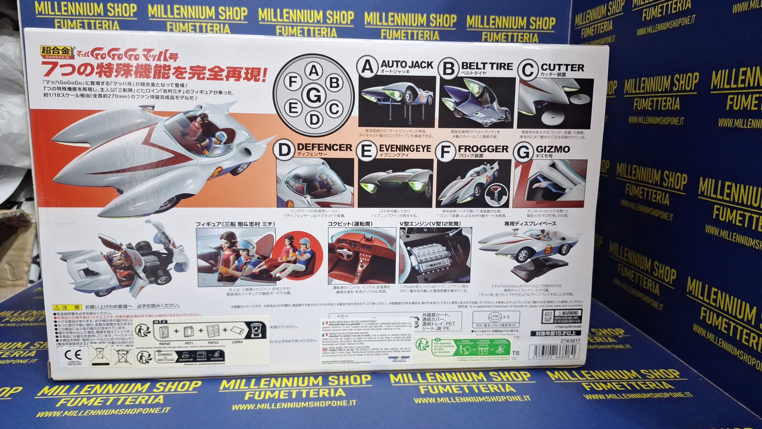 Si tratta di un modello finito in scala 1/18 (lunghezza totale circa 270 mm) che riproduce sette funzioni speciali, espedienti e trucchetti da usare in gara…include anche le figure dei protagonisti Speed Racer e Trixie! La confezione comprende anche una base display ed un box in acrilico per esprre l’oggetto